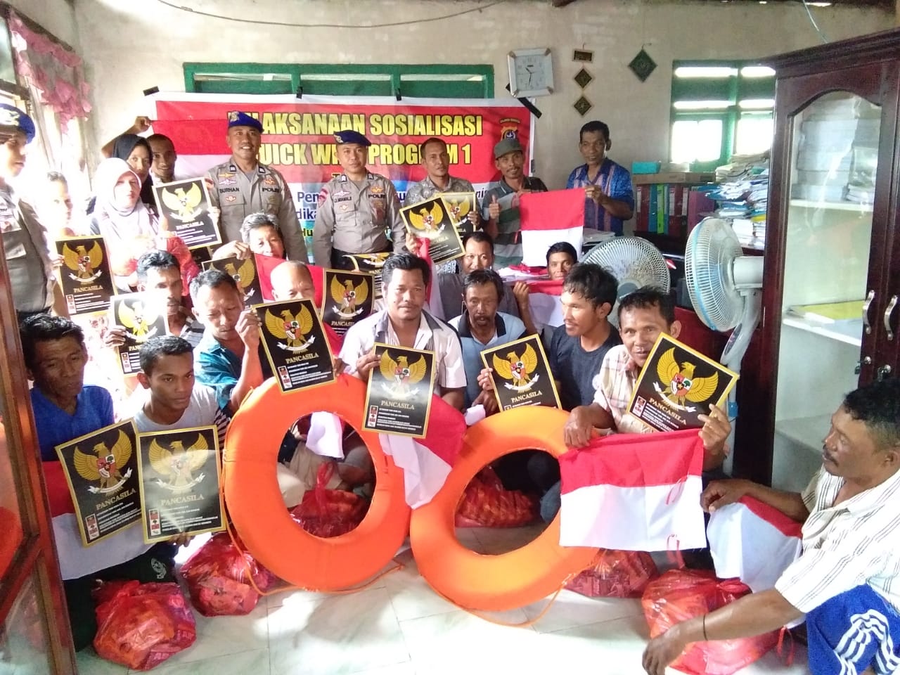 Life bouy 12 buah, paket sembako 20 buah, teks pancasila 20 buah, dan bendera merah putih 20 Lembar.