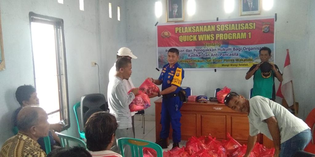 Wakatobi, Koransultra.com– Satuan Polisi Perairan Polres Wakatobi melaksanakan Sosialisasi Quick Wins Polri Program 1 tentang Penertiban dan penegakkan hukum bagi organisasi radikal dan anti pancasila kepada masyarakat pesisir atau nelayan di 3 Desa yang ada di Mola Raya, Kecamatan Wangi- Wangi Selatan, Kabupaten Wakatobi. Kegiatan tersebut berlangsung di Aula 3 Desa tersebut. Selasa (28/05/2019).