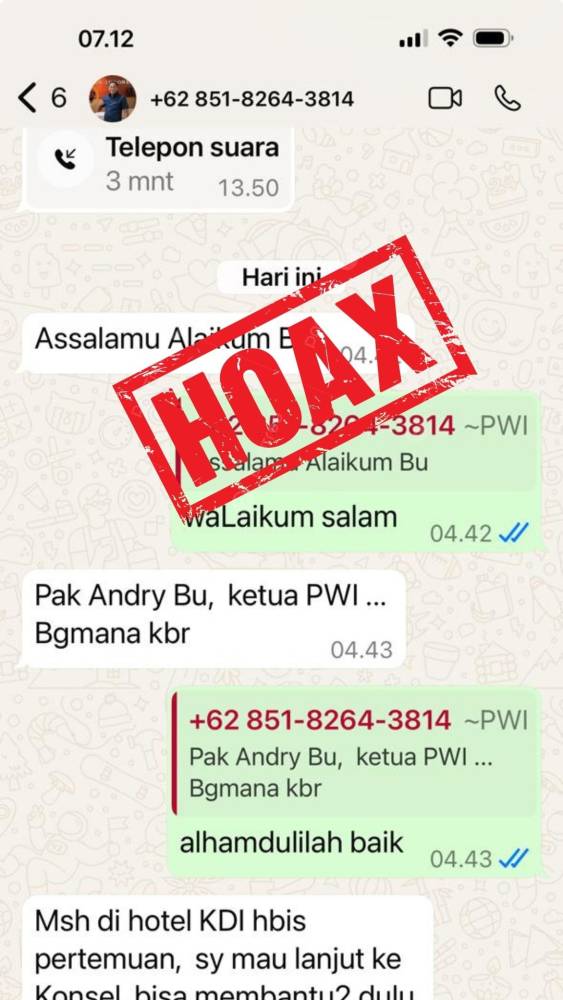 “Pagi tadi saya sudah resmi melaporkan hal ini ke Polres Konawe terkait penipuan whastapp yang menggunakan profile fotoku serta mengaku sebagai ketua PWI Andry,” ujarnya.