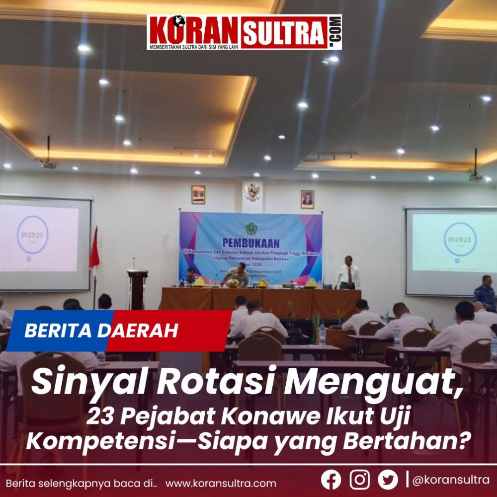 Konawe, Koransultra.com – Sinyal rotasi besar-besaran di tubuh birokrasi Pemerintah Daerah Kabupaten Konawe makin mulai menguat. Pemerintah daerah resmi menggelar Uji Kompetensi Jabatan Pimpinan Tinggi (JPT) Pratama 2025 pada 21–23 November yang bertempat disalah satu hotel di Kendari Provinsi Sulawesi Tenggara, sebuah langkah yang diyakini sebagai pintu masuk reshuffle pejabat eselon II.