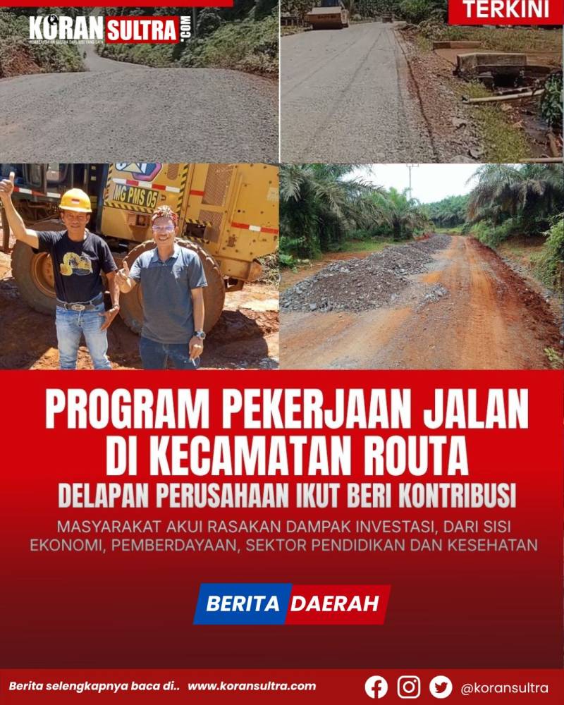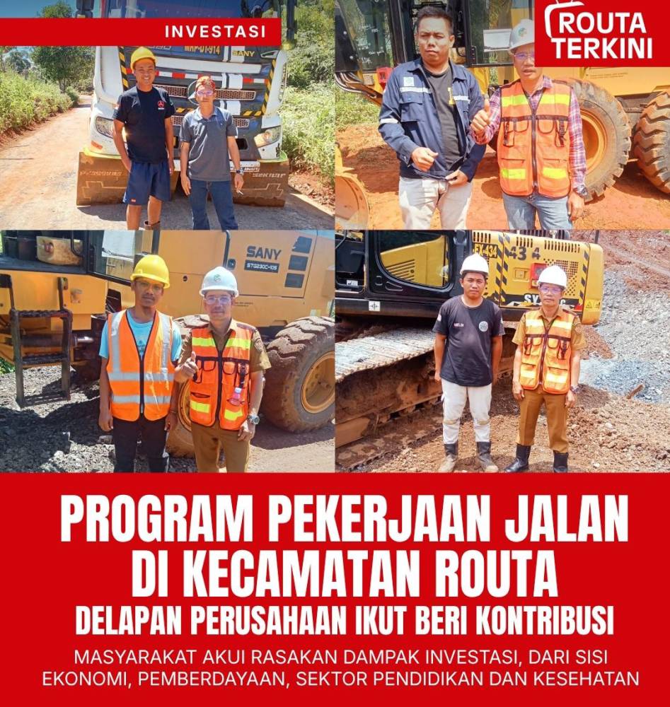 Unaaha, Koransultra.com – Program perbaikan infrastruktur jalan sepanjang kurang lebih 45 kilometer di Kecamatan Routa mulai menunjukkan dampak nyata bagi masyarakat, setelah pemerintah Desa Lalomerui bersama sedikitnya delapan perusahaan yang beroperasi di Kecamatan Routa terlibat dalam pembangunan jalan yang digagas Pemerintah Desa Lalomerui ini dengan target menghubungkan jalan dari Desa Lalomerui hingga Kelurahan Routa. Selain pembangunan jalan itu, Masyarakat setempat juga merasakan manfaat atas kehadiran investasi didaerah mereka, diantaranya hadirnya program layanan kesehatan gratis, pemberdayaan Bumdes sebagai penyalur hasil pertanian warga yang dipasarkan ke areal Perusahaan tambang, penyerapan tenaga kerja lokal, serta Pembangunan infrastruktur Sarana Pendidikan, Bantuan Beasiswa, dan sejumlah manfaat lainnya yang diungkapkan oleh Kepala Desa Lalomerui, Taksir Unggahi saat wawacarai Awak Media, pada Jum’at 10/04/2026.