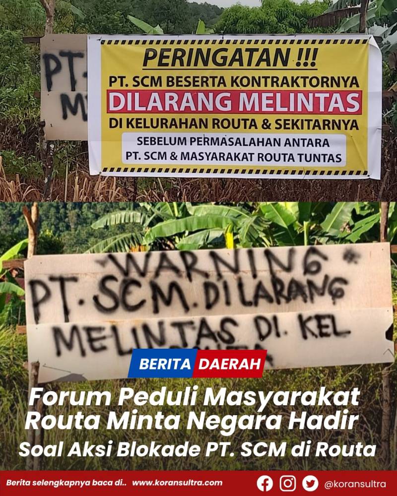 Unaaha, Koransultra.com – Konflik berkepanjangan di wilayah lingkar tambang Kecamatan Routa, Kabupaten Konawe, mulai berdampak pada ribuan warga. Aksi unjuk rasa yang kerap dilakukan sekelompok warga Kecamatan Routa yang menuntut pembangunan smelter di wilayah lokal kini berujung pada pelarangan aktivitas bagi PT Sulawesi Cahaya Mineral (SCM) di sejumlah wilayah Kecamatan Routa. Papan larangan berukuran besar dengan warna mencolok ini kini terpampang di gerbang masuk Kelurahan Routa.